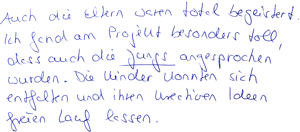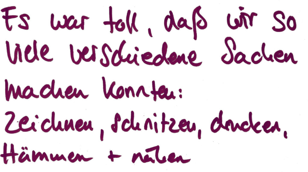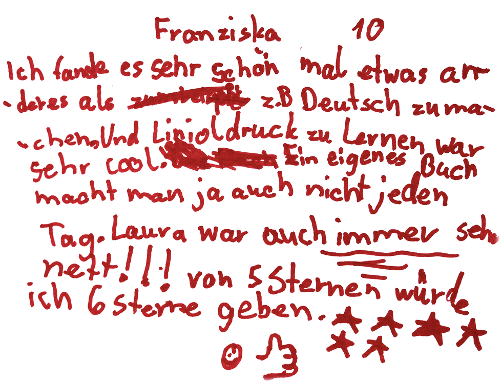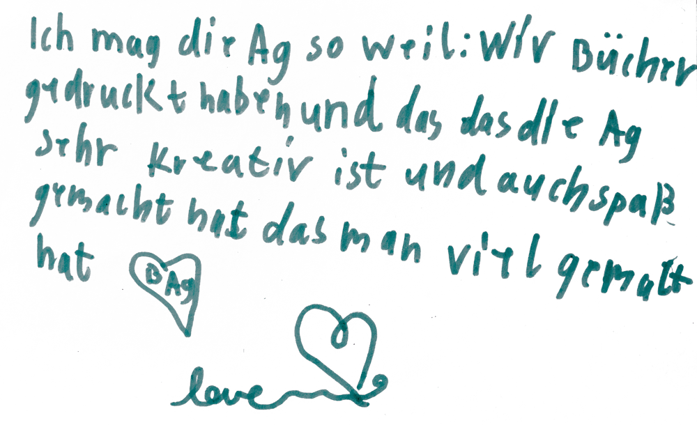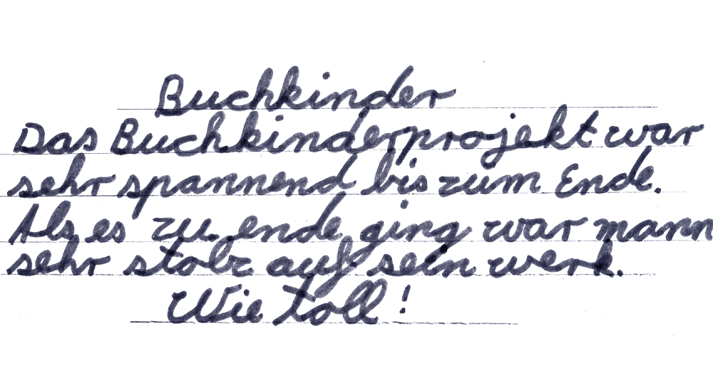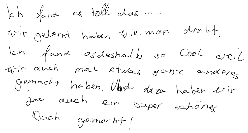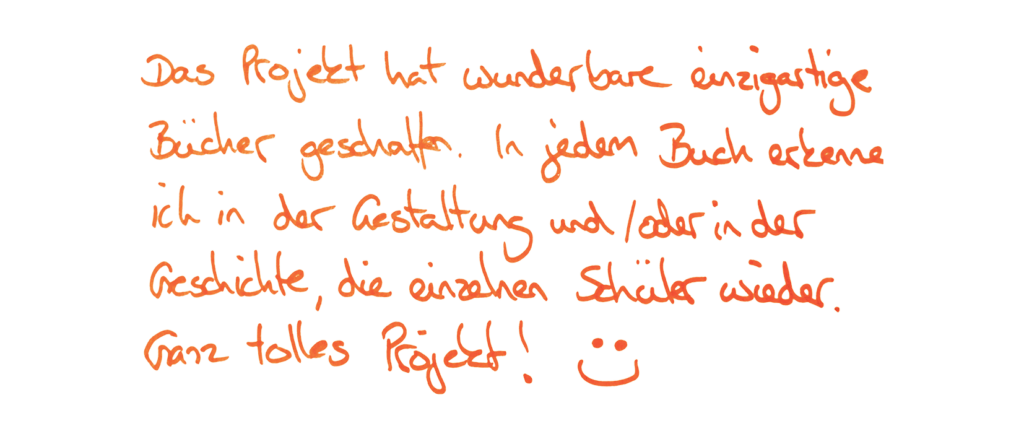 Dabei beobachten wir in jeder Gruppe, wie wirklich ALLE Kinder von der intensiven Arbeit an ihrem Buch profitieren. Auch diejenigen, die seltener Erfolgserlebnisse in der Schule haben. Die einzelnen Arbeitsschritte sind Angebote an viele verschiedene Begabungen, literarischer, künstlerischer und handwerklicher Art.