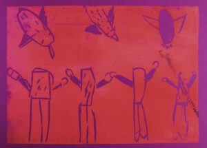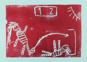 Die Kinder schreiben im Deutschunterricht ihre Geschichten, ohne in ihrer Fantasie eingeschränkt zu werden. Wir leiten sie an, die Texte mit etwa fünf Bildern zu illustrieren. Erst werden diese vorgezeichnet und auf Linolplatten übertragen, danach werden Linolschnitte gefertigt. Jetzt können die Bilder gedruckt werden. Sind die Texte fertig illustriert, müssen noch Titelblätter gestaltet und am Ende die Bücher gebunden werden. Nach Beendigung des Projektes findet eine Abschlusspräsentation statt, bei der die Geschichten den Eltern und Geschwistern gezeigt und vorgelesen werden.