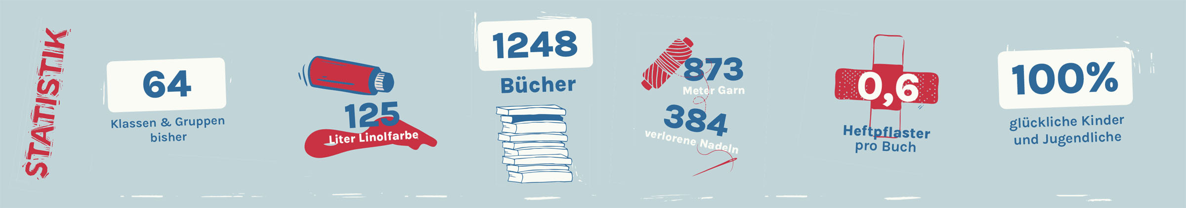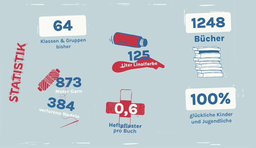 In festen Gruppen und fortlaufenden Kursen – an den Schulen unterrichtsbegleitend – werden die Kinder und Jugendlichen dabei angeleitet, ihr eigenes Buch zu gestalten, zu drucken und zu binden.